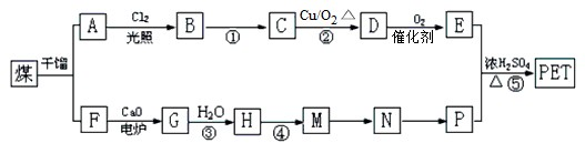 .现以煤的干馏产品A与F为质料制备PET,生产流程如图所示.其间A为烃,含碳元素的质量分数为90.6%,其蒸气的密度是空气密度的3.66倍,能使酸性高锰酸钾溶液褪色,但不能使溴水褪色.M分子里一切原子共平面.