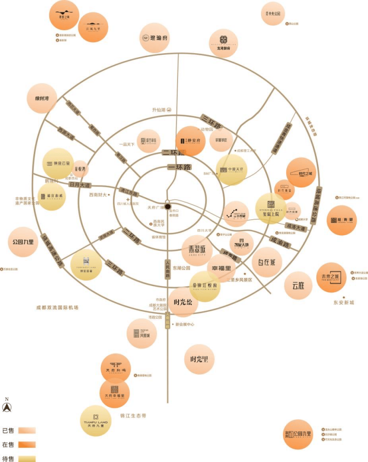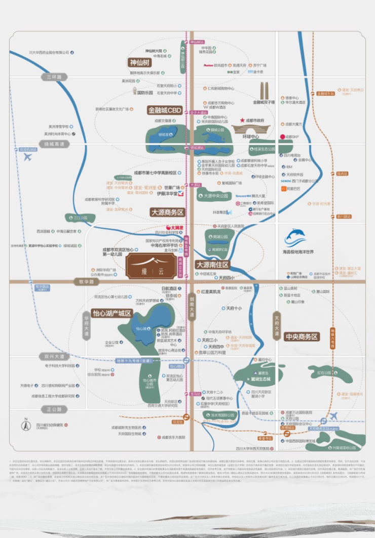 神仙树、金融城CBD、锦城湖、大源商务区、大源南住区、锦江生态带、怡心湖产城区、浅水湾等成都壕宅住区,因剑南大路而串联